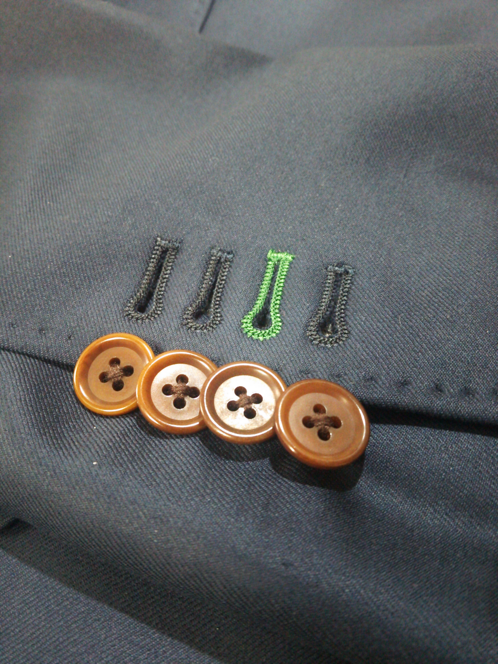 本切羽、またの名を本開きともいいます。袖口の釦ホールを開けるようにするカスタマイズです。ドクターが袖をまくりたいからこの仕様が出来たとかいろいろ説がありますが、やはりオーダーメイドならではのカスタマイズで、これもとても人気があります。新人さんにはあまりオススメしませんが、慣れてきたら、一つ釦を外してみたりして見るのもアリです。先輩に教えてあげてもいいかもしれませんね。