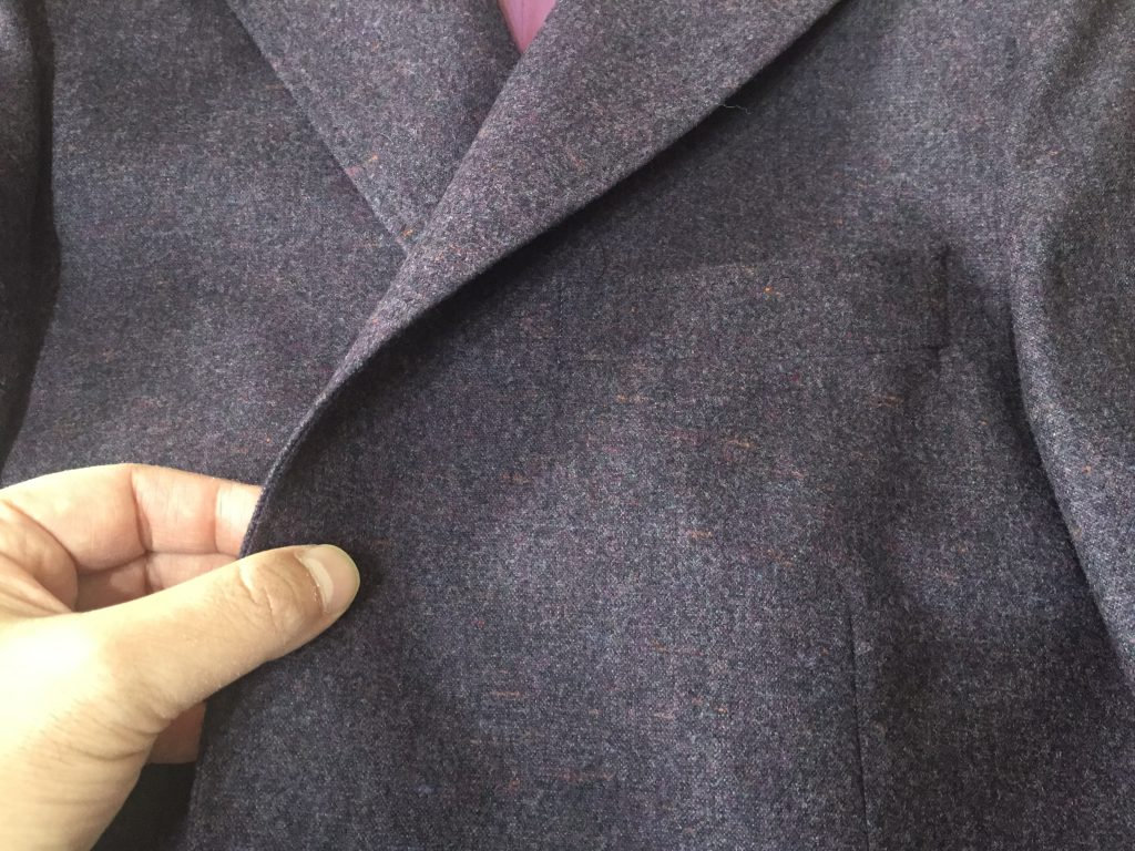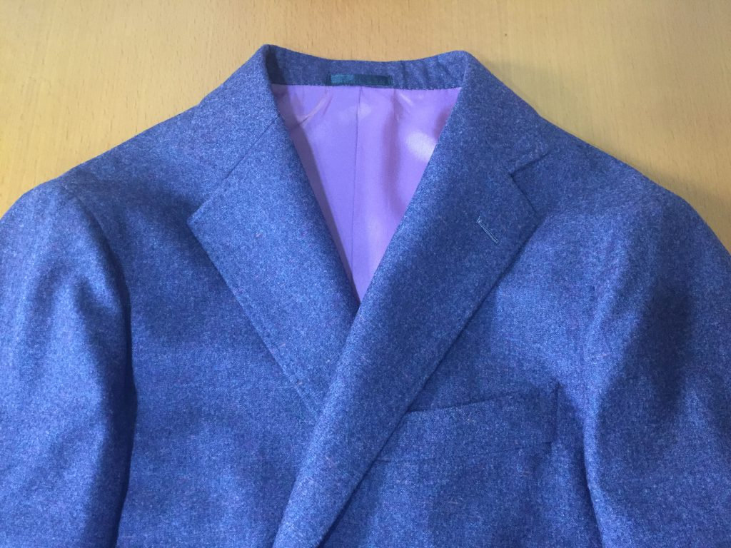 このフランネルという素材は、カッチリとした印象のテーラード系にするもよし、画像のように一切の芯地やパットを外してより軽く、ちょっと抜け感のある仕立てにしてもいいですね。