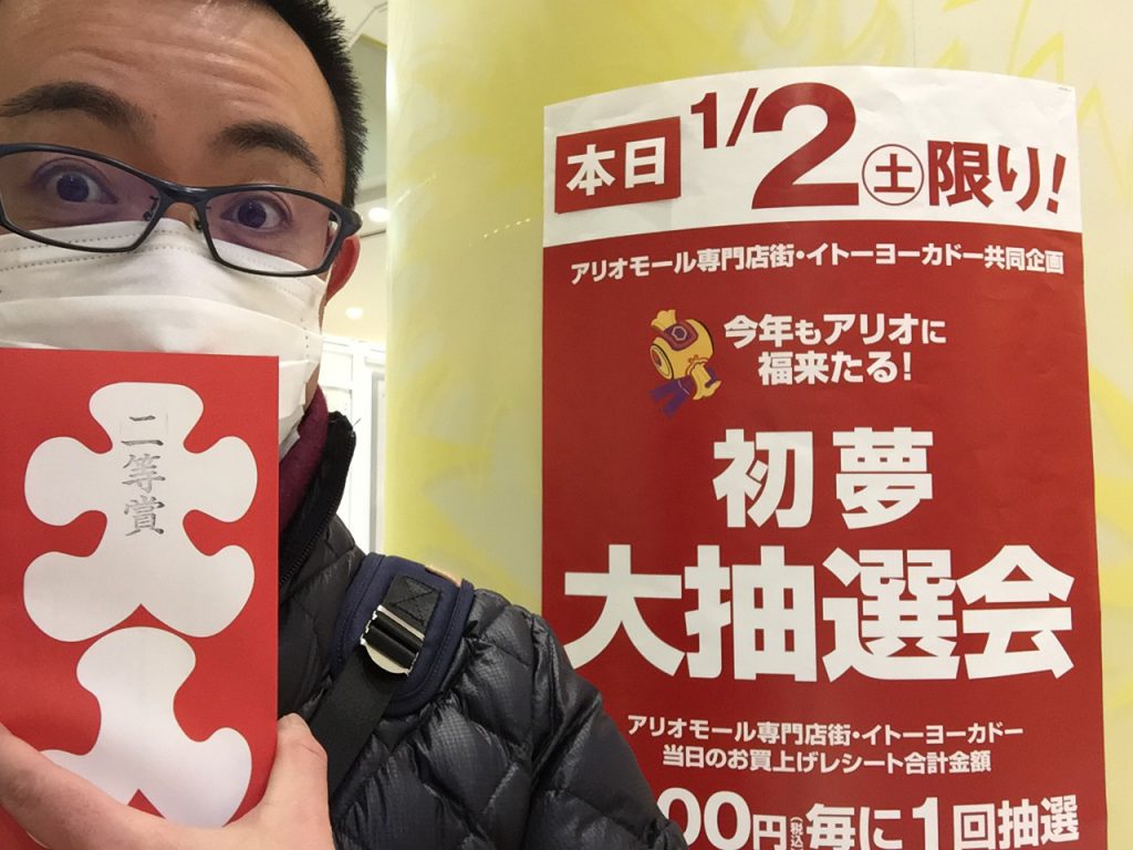 お正月に、かみさんとコーヒー飲みながら、話しながら、スマホいじりながら、初売りとバーゲンの違いがもう無いよなと思いながら、周りを観察して客数のチェックと単価を割り出しつつ、50%オフからさらにタイムセールで20%オフとか言ってるけど元上代おかしいだろそれって思いながら、でもそういうおかしなセールをしていないとモールの中では見向きもされないお店があるよなって思いつつ、そういう店はだいたいPOPが無いのがもったいないと残念な気持ちになりつつ、モール内の人の買い物袋の大きさと購入率を横目で調べつつ、タリーズの福袋の中身を見ながら希望通りで良かったなと思いつつ、アリオの福引の当たり確立を計算して当たるタイミングを見抜いて、うまい具合にいい感じに並んで、3,000円の商品券をゲットして、取りあえず自慢の為に自撮りしていた時に思ったのは概ねそんなことです(苦笑)