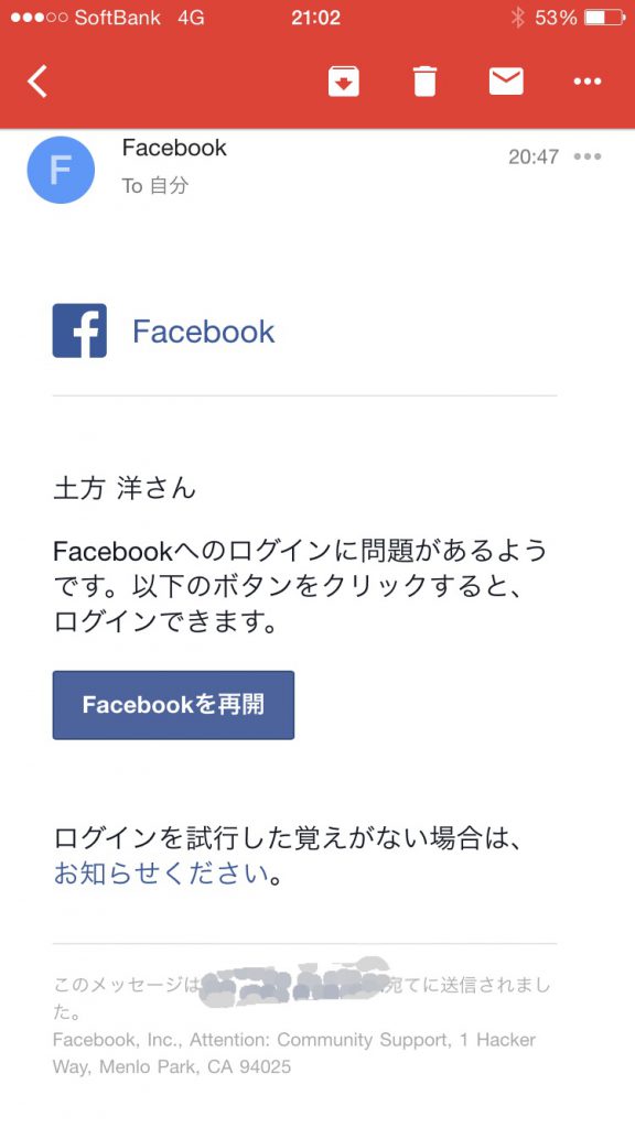 先日夜ですが、スマホにてFacebookを閲覧している時に、メール通知がきました。