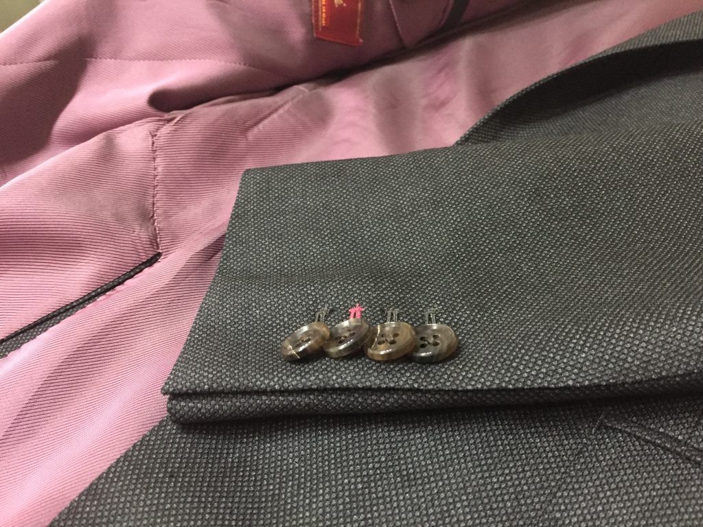 俗に色遊びという袖口のボタンホールの色を裏地の色味に合わせるというカスタマイズ。