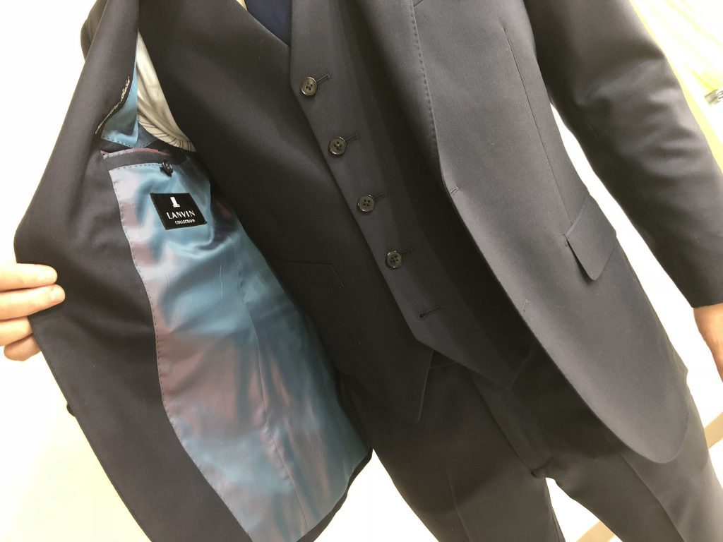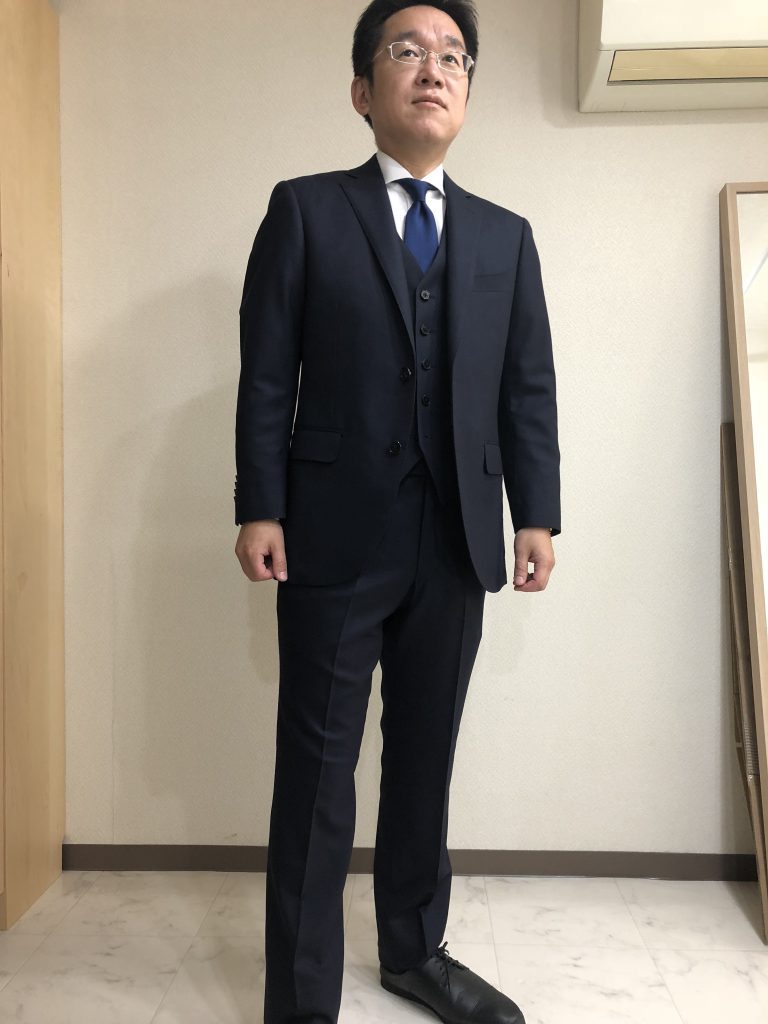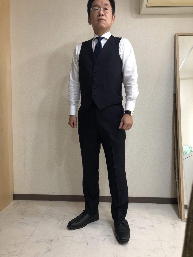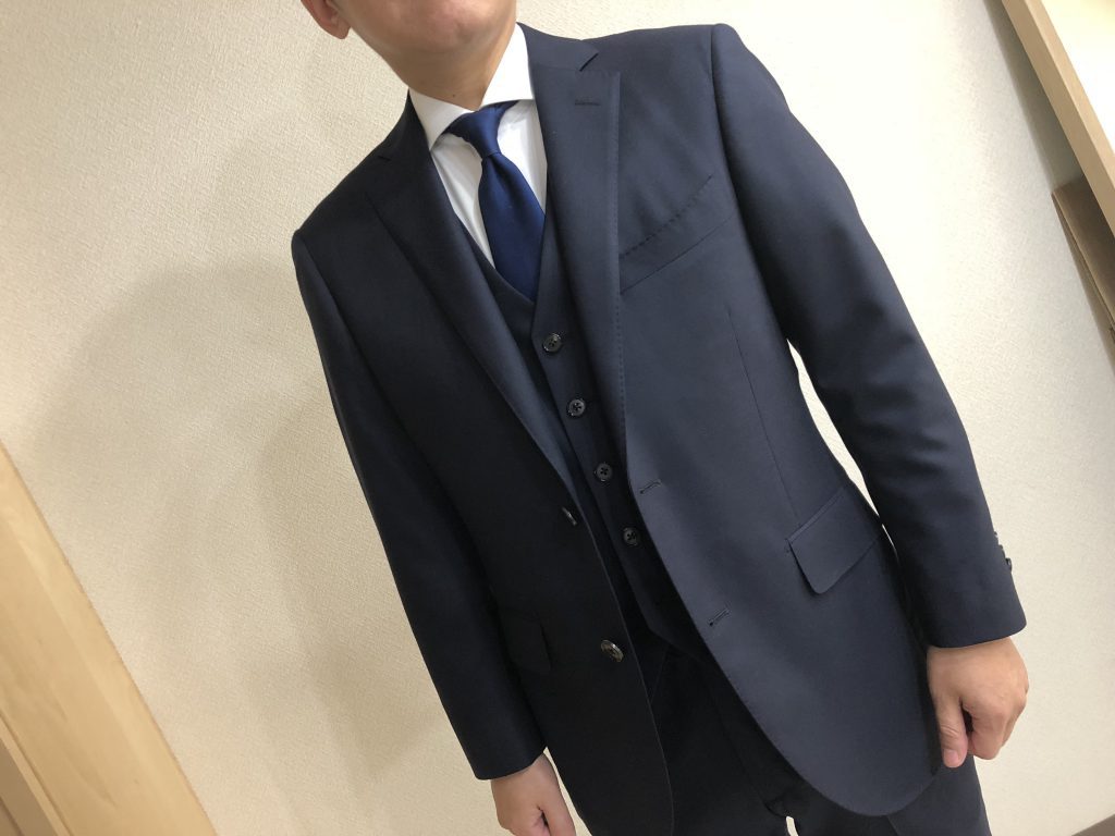 そして、そこに近年の正統派スーツへの回帰の流れにのっとりスリーピースで作成しました。