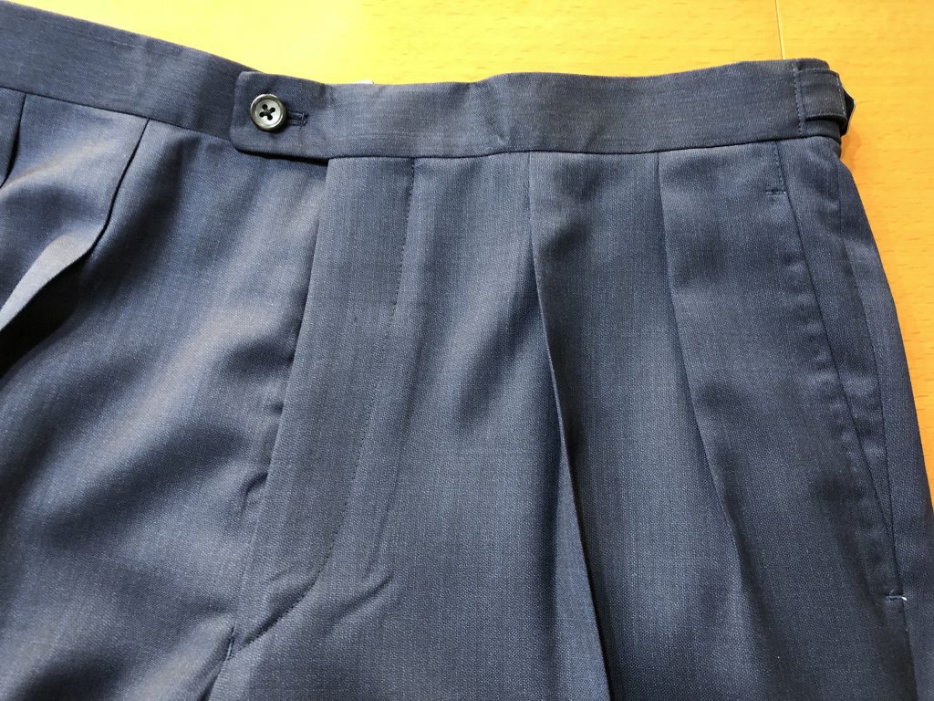 パンツは好みの分かれるところではありますが、今回の色気のあるスーツでは股上をやや深めに設定し、タック(プリーツ)は2つを基本としました。
