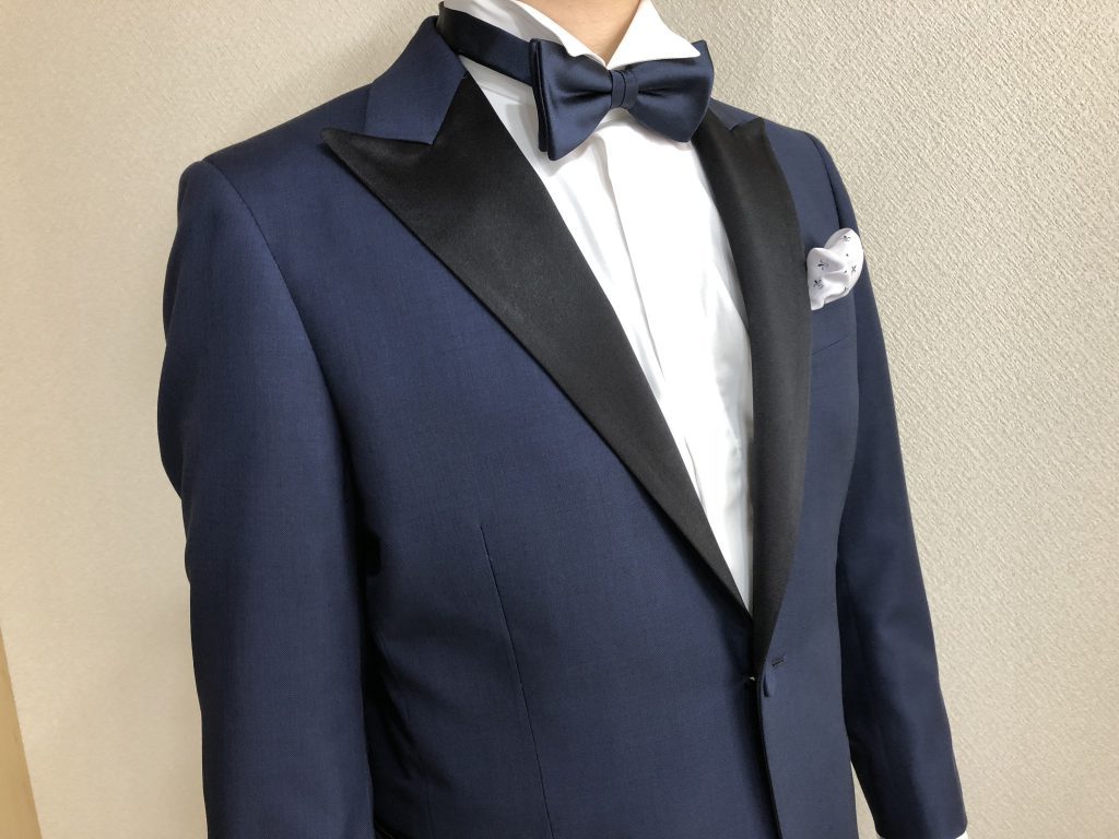 今回はそのフォーマルウェアの中で一番知名度のあるタキシード、それもキレイなネイビーブルーで仕上げましたのでご覧になってみてください。