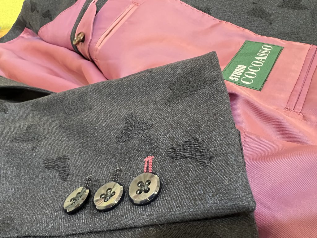 そして誰も分かってくれないけど、実は袖のボタンホールも連動させた色をアクセントにしておく。