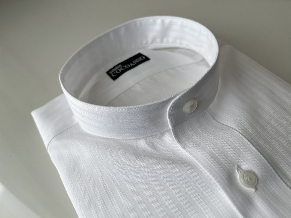 ちなみに参考程度にバンドカラーというシャツが少し前に流行りましたが、デザイン的な大きなくくりでは同じですし、意味するところもほとんど同じです。