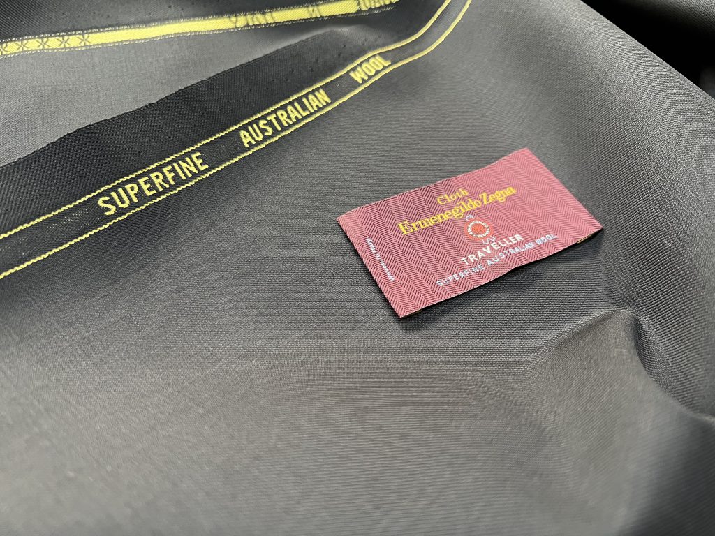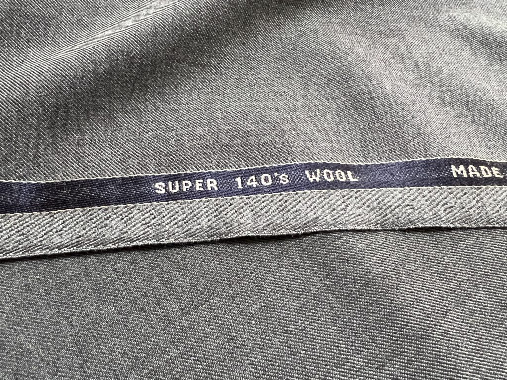 既製品でも名前の通った生地を採用している場合はたいていその生地ブランドの織りネームをジャケットの内側ないし左袖にしつけてありますので、そこに記載があるかと思います。