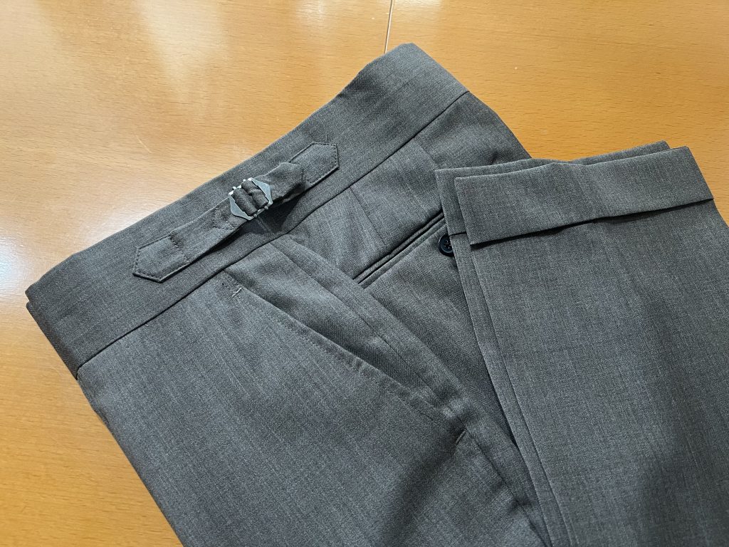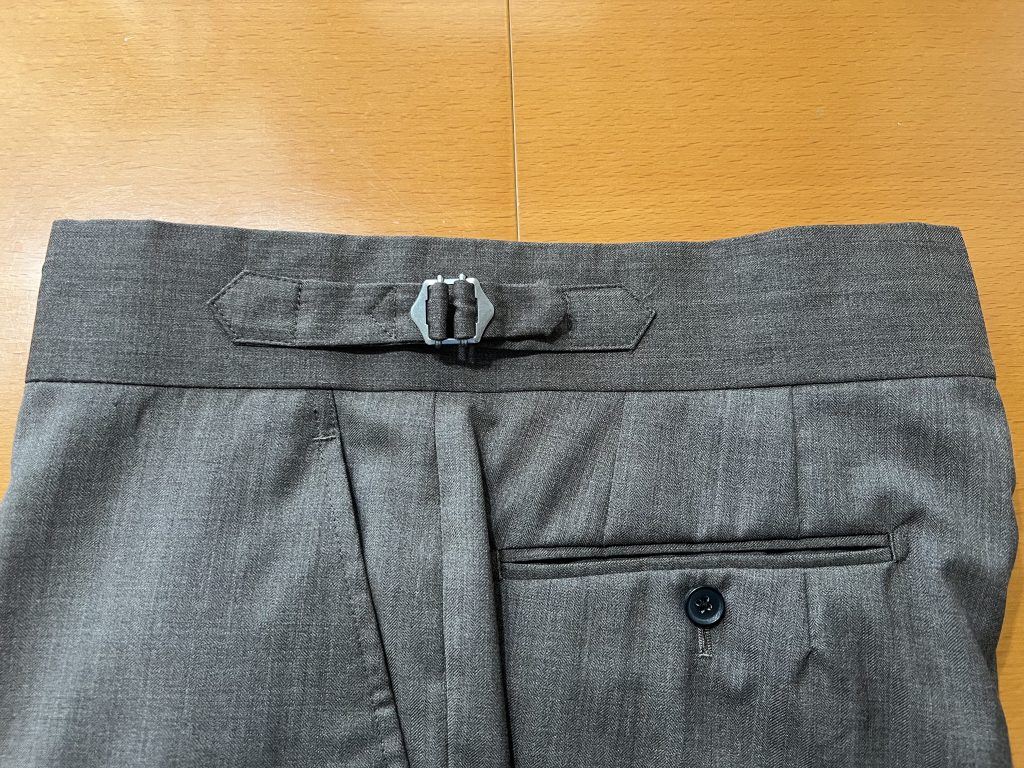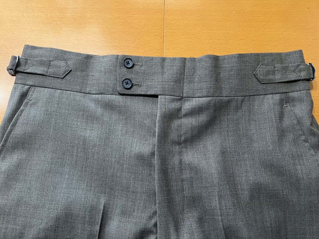 オーダーパンツはこのようなベルトレスのサイド尾錠仕様なども作成することが出来ます。