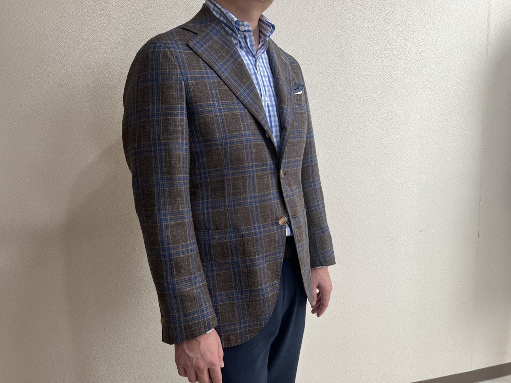 衿幅は少し太めに、ゴージラインも高めにした段返り3つボタンジャケットです。