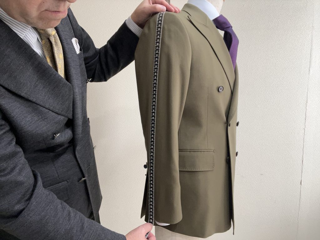 近年はパターンオーダーというサイズサンプルを着用していただき、例えば袖丈などをそこから足し算、引き算をして作るという手法が一般的になりました。