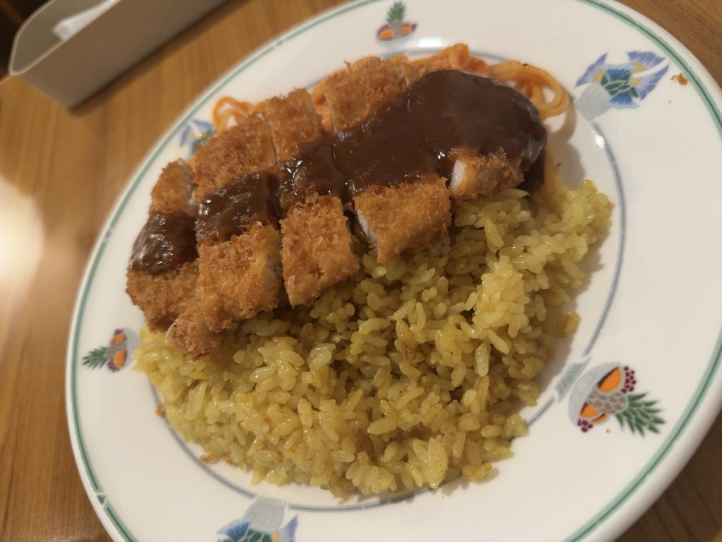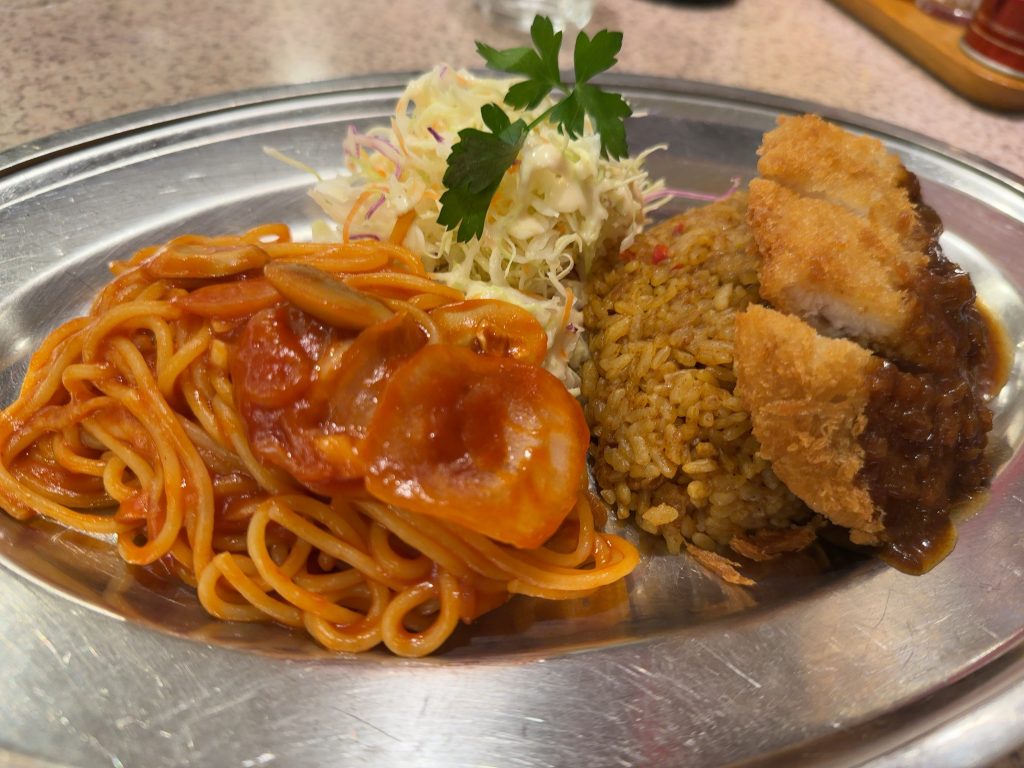 ドライカレー、スパゲティ、とんかつのコンボを一皿にまとめた長崎のご当地B級グルメですね。
