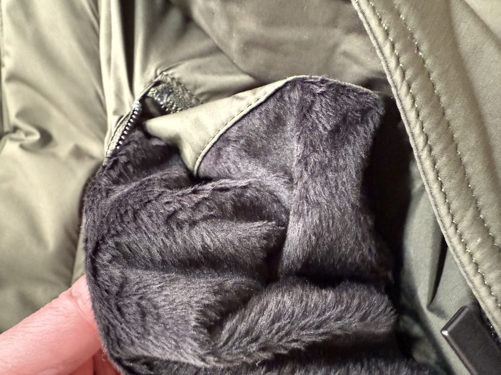 そしてポケット内部は両面がフワフワのボア仕様になっていますので、完全なハンドウォーマーとして機能しますし、このポケットの設置場所とナナメ形状と相まって手を入れやすくこれは気持ちいいので最高です。