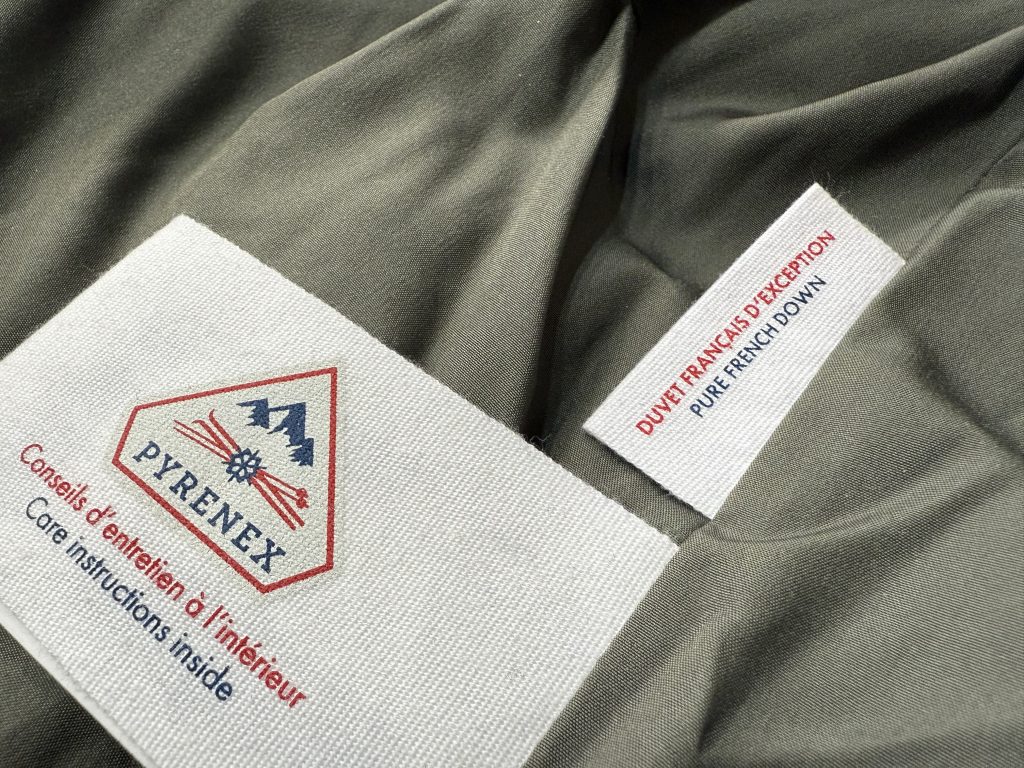 内側にはピュアフレンチダウンであることと、ユーザーは追跡出来ないのですが、正しく採取したダウンであることを証明することが出来ると言われているバーコードなどの表記が縫いつけられています。