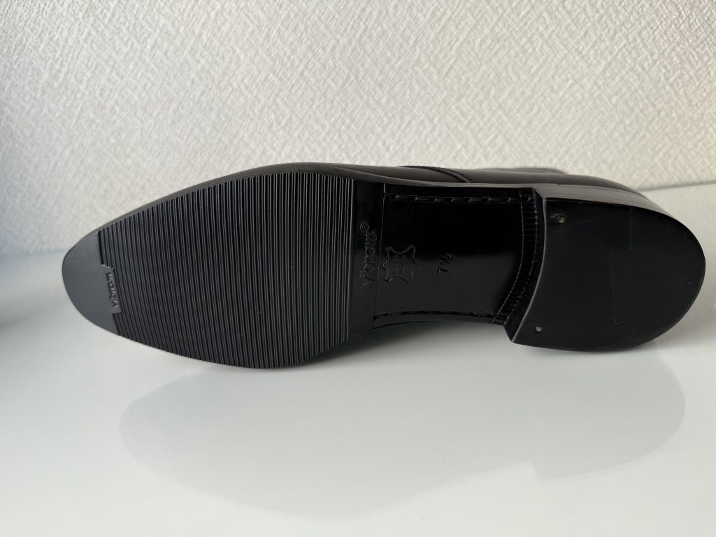 今回はソールは基本革なのですがつるつるしている床ですと滑りやすいので、ビブラム社のゴムを半張りしています。