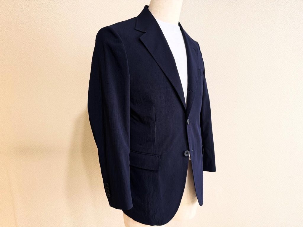 カッチリとしたテーラードスタイルではなく、やさしい印象にしたビジネス服