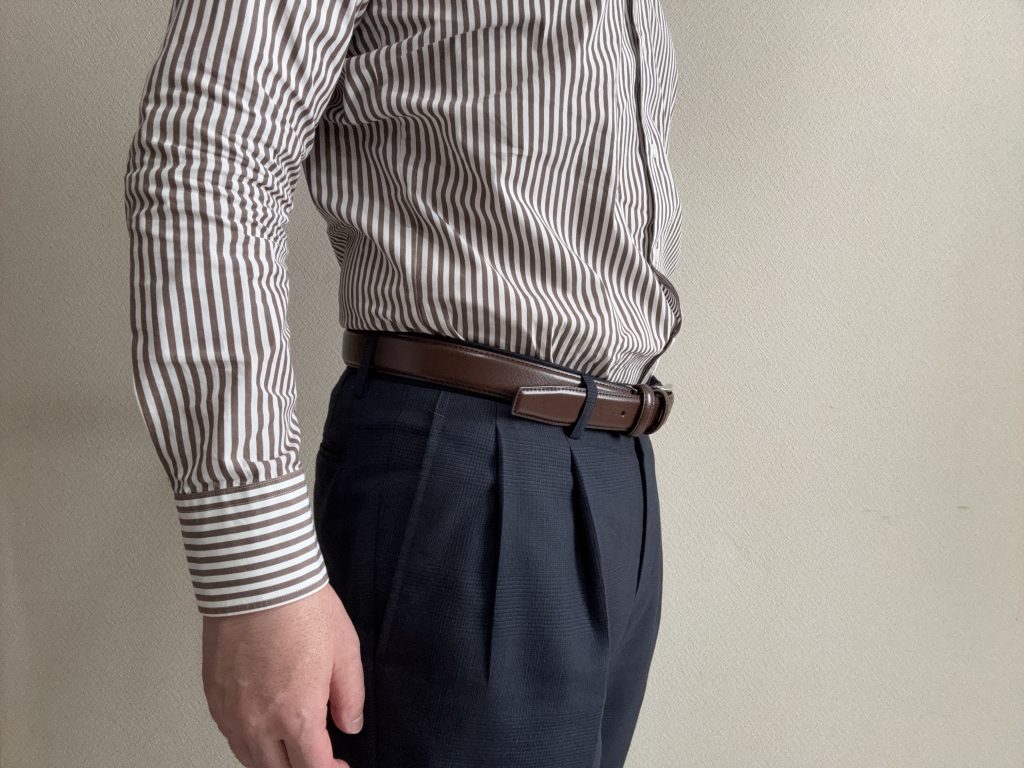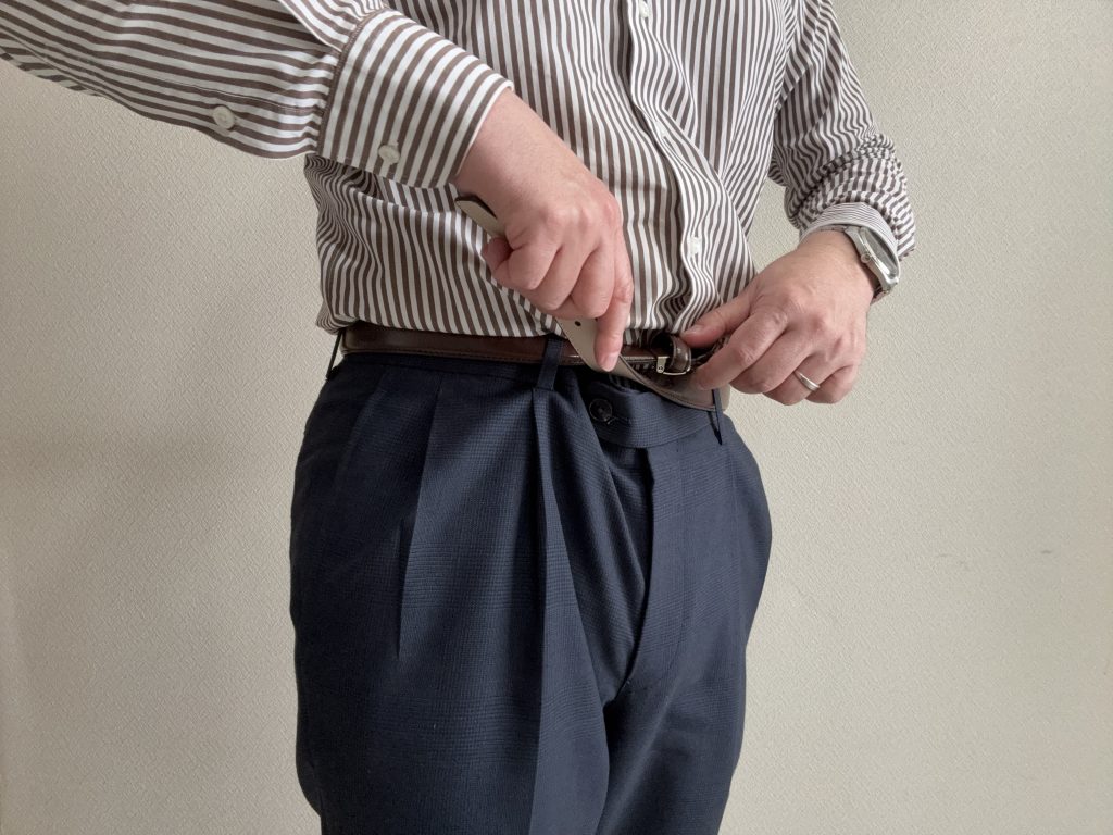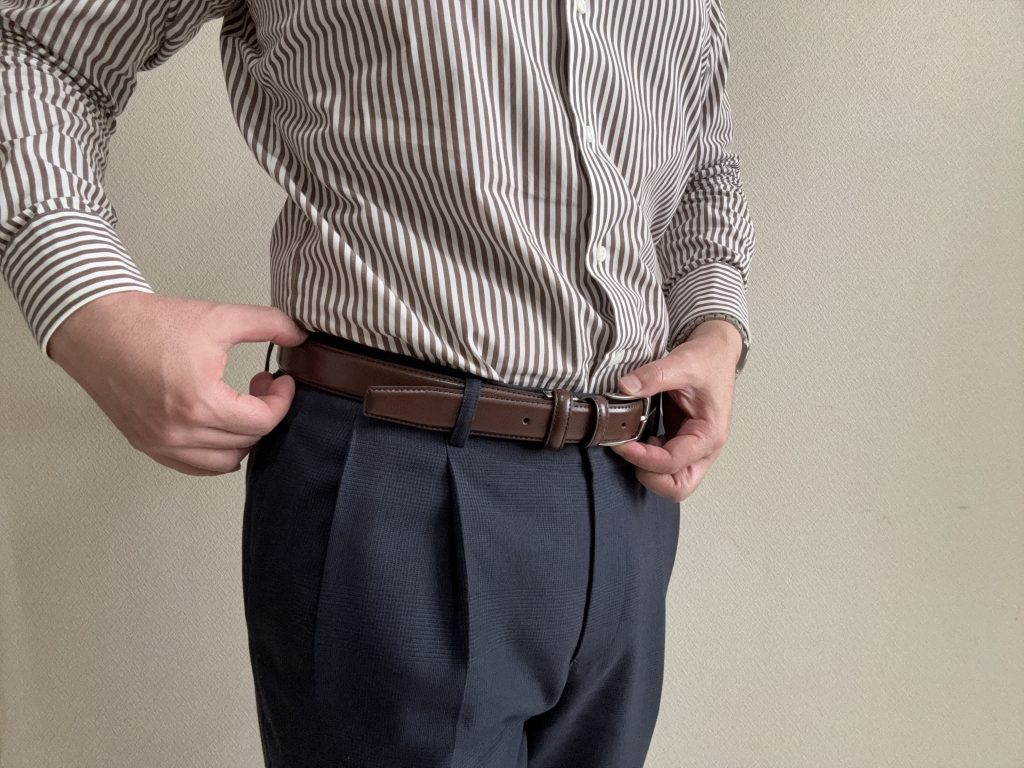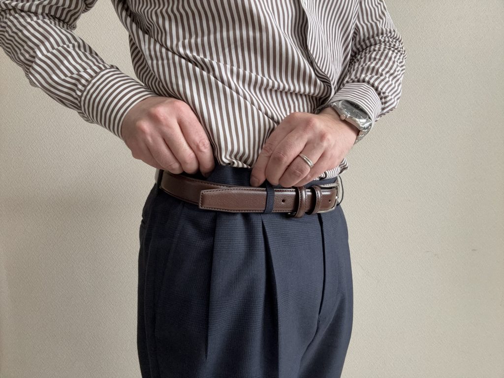 あくまでもドレスパンツやそれに類するパンツに使うベルトはこのくらいにウエストに添うように留めるようにしてみよう。